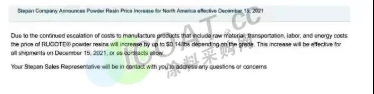 自12月15日起上调北美地区RUCOTE® 粉末树脂的价格,上涨0.14美元/磅(约1967元/吨)。