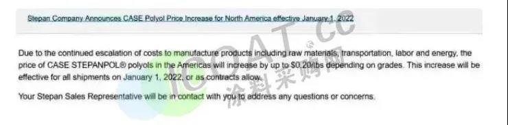 自2022年1月1日起上调北美地区CASE STEPANPOL® 多元醇的价格,上涨最高达0.20美元/磅(约2810元/吨)。