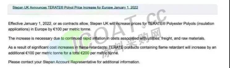 斯泰潘英国将于2022年1月1日起上调欧洲地区TERATE® 聚酯多元醇(绝缘应用)的价格,上涨100欧元/吨(约721元/吨)。此外由于阻燃剂成本显着增加,阻燃级产品额外上调100欧元/吨,总计上涨200欧元/吨(约1442元/吨)。