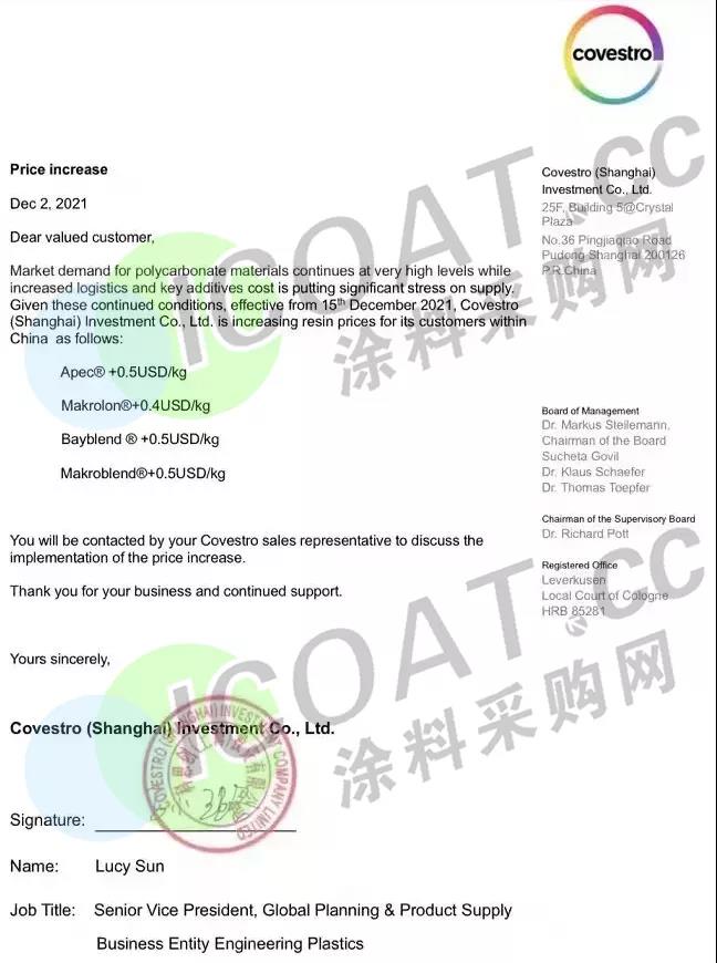 科思创:最高上涨3185元/吨12月15日起上调中国地区PC系列产品的售价: