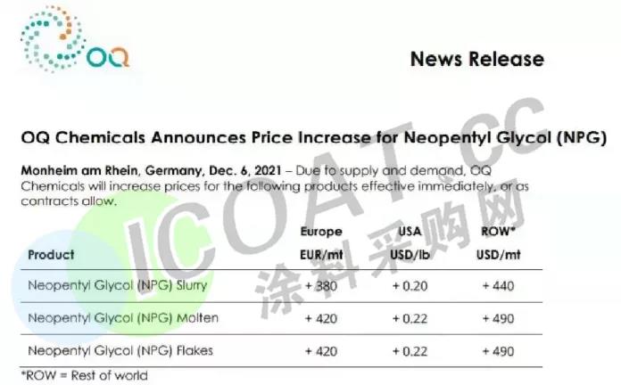 将于2022年1月1日起在全球范围内上调所有等级的新戊二醇(NPG)产品的售价,其中除欧洲和美国外(包括中国),其他地区上涨440-490美元/吨(约2808-3121元/吨)之间。