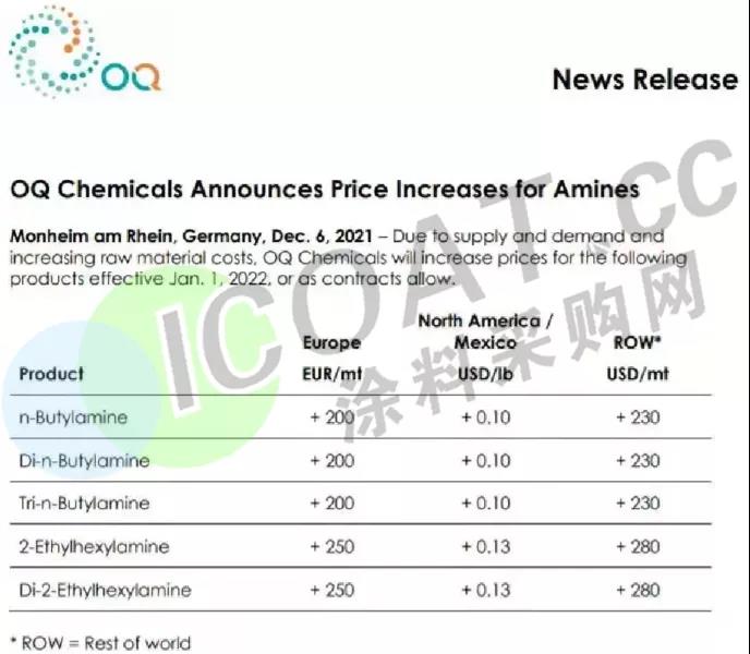 将于2022年1月1日起在全球范围内上调正丁胺、二正丁胺、三正丁胺等在内所有等级的胺类产品的售价,其中除欧洲和美国外(包括中国),其他地区上涨230-280美元/吨(约1465-1783元/吨)之间。