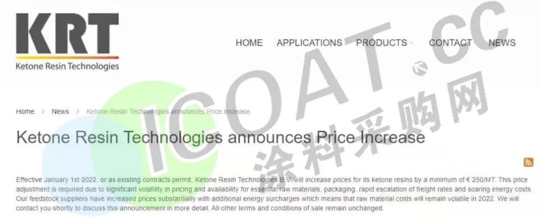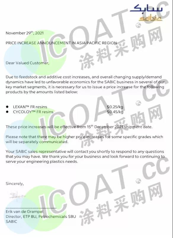 将于2022年1月1日起在全球范围内上调公司所有树脂产品的售价,至少上涨250欧元/吨(约1801元/吨)。