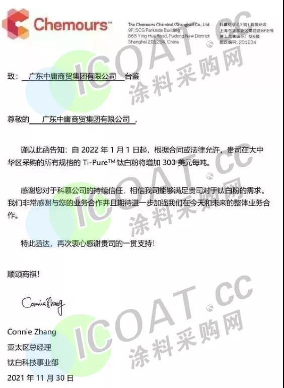 自2022年1月1日起,在大中华区所有规格的Ti-Pure™ 钛白粉价格将上调300美元/吨(约合人民币1915元/吨)。
