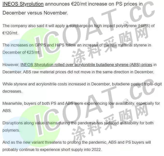 欧洲地区12月苯乙烯单体合约价,较之10月上涨约23欧元/吨(约165元/吨),同时还上调了PS的售价,其中GPPS上涨20欧元/吨(约144元/吨),HIPS则需额外收取120欧元/吨的附加费(累计上涨约1060元/吨)。ABS的价格也相对进行上调。