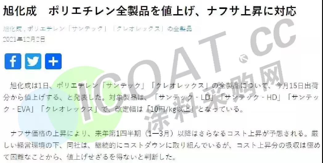 将于12月15日起上调公司Suntec LDPE/HDPE/EVA以及Creolex mPE(茂金属PE)等制品的价格10日元/千克(约563元/吨)。