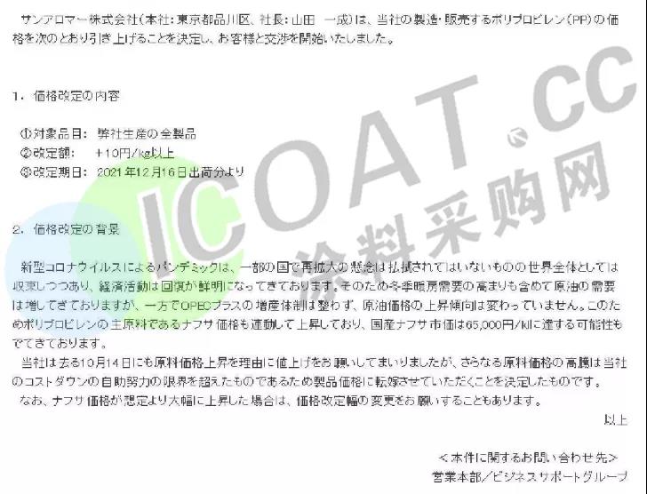 将于12月16日起上调公司生产的所有等级PP(聚丙烯)的售价10日元/千克(约562元/吨)。