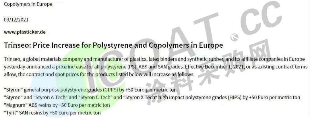 TYRIL™SAN树脂上调50欧元/吨(约359元/吨)。