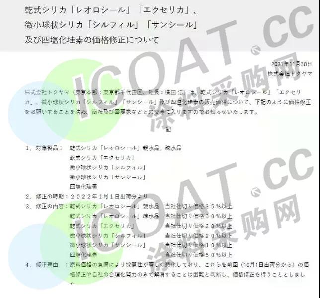 将于2022年1月1日起上调白炭黑(二氧化硅)产品的售价,REOLOSIL™气相法白炭黑亲水性产品上调35%以上,REOLOSIL™气相法白炭黑疏水性产品上调35%以上,EXCELICA™气相法白炭黑上调20%以上。Silfil™球形白炭黑上调20%以上,Sunseal™球形白炭黑上调10%以上,四氯化硅产品上调50%以上。