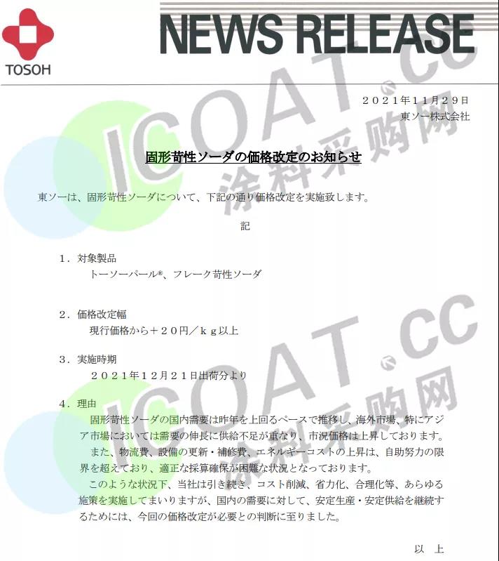 东曹株式会社:产品调涨25%-30%
