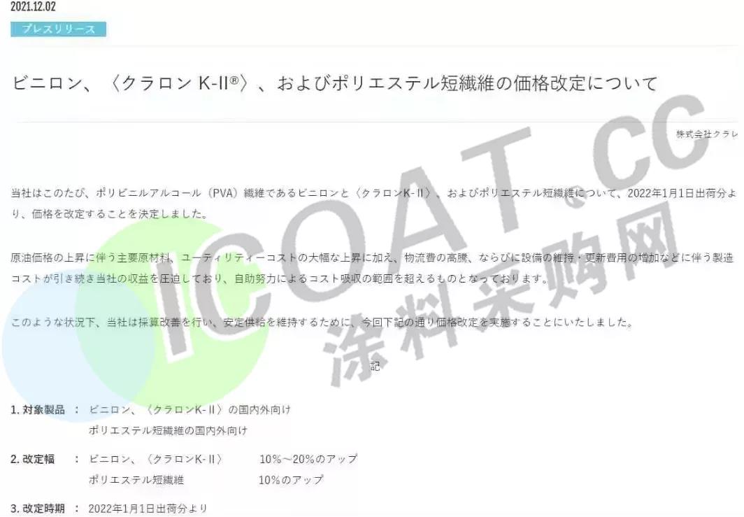 将于2022年1月1日起,在全球范围内上调部分纤维产品的售价,其中KURALON™和MINTVAL/KURALON™ K-II 聚乙烯醇(PVA)纤维产品涨幅10%-20%,聚酯(PET)短纤产品涨幅为10%。