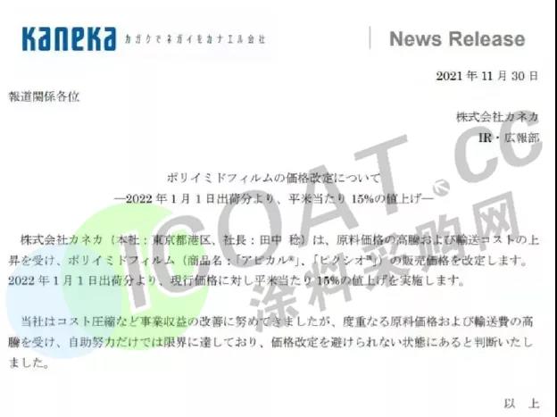 将于2022年1月1日起上调聚酰亚胺(PI)薄膜产品的售价,涨幅在15%以上。