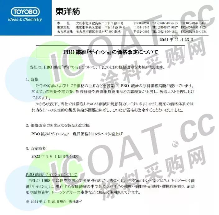 将于2022年1月1日起上调Zylon(柴隆)® PBO产品的售价,涨幅在5%-7%。