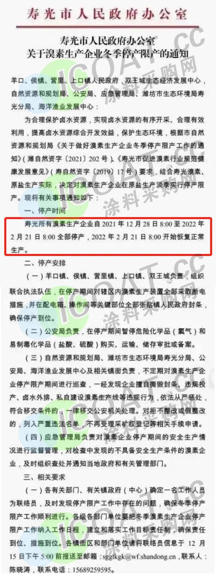 近日,寿光市人民政府办公室发布了一则关于溴素生产企业冬季停产限产的通知,寿光所有溴素生产企业自 2021年12月28日8:00至 2022年2月21日8:00全部停产。