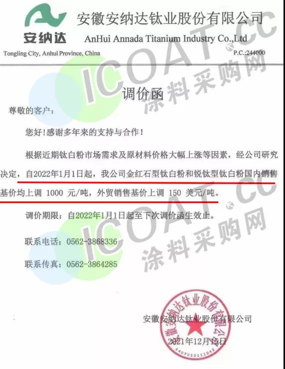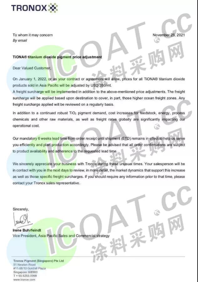 钛白粉巨头特诺(Tronox):2022年1月1日起,在亚太地区销售的所有二氧化钛产品的价格将上调350美元/吨(约合人民币2237元/吨)。