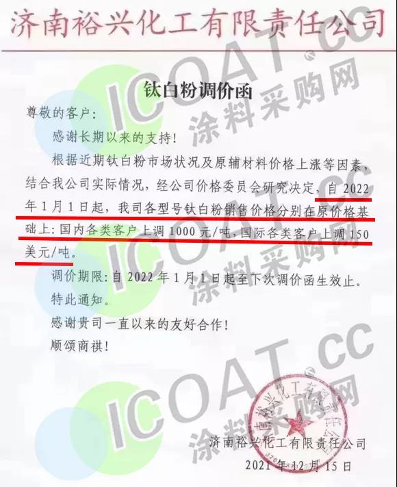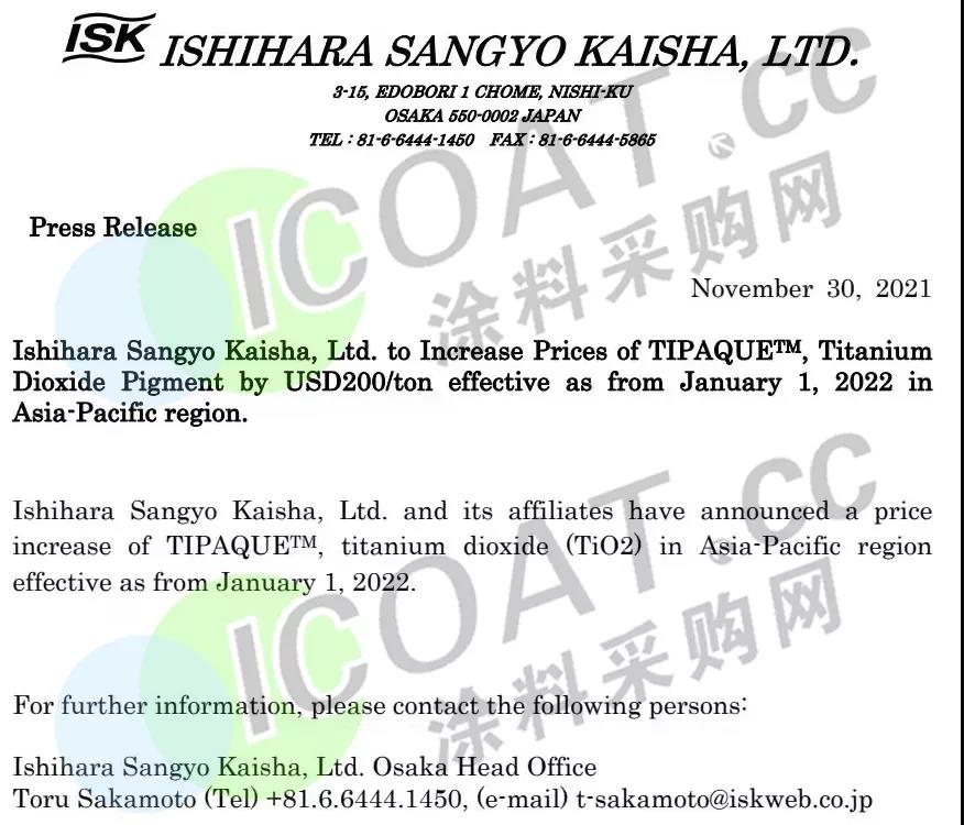 石原ISK:2022年1月1日起,上调除日本本土外所有地区钛白粉的售价200美元/吨(约合人民币1274元/吨)。