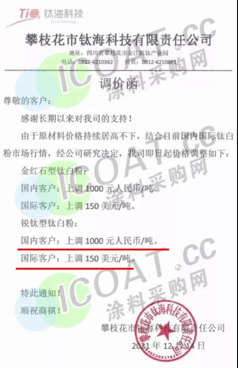 钛海科技:即日起价格调整如下:金红石型、锐钛型钛白粉国内客户:上调1000元/吨,国际客户:上调150美元/吨。