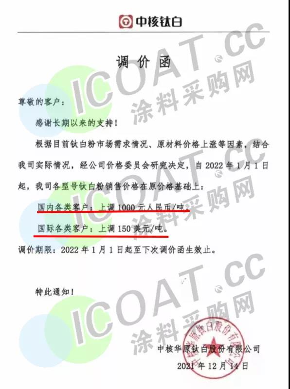 中核钛白:自2022年1月1日起,各型号钛白粉销售价格在原价格基础上:国内各类客户:上调1000元/吨,国际各类客户:上调150美元/吨。