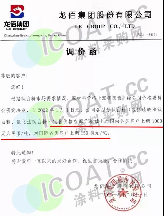 龙佰集团:自2022年1月1日起,公司各型号钛白粉(包括硫酸法、氯化法)销售价格在原价基础上对国内各类客户上调1000元/吨,对国际各类客户上调150美元/吨。