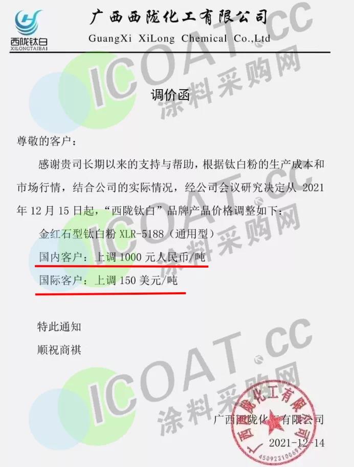 据涂料采购网了解,本周内已有近10家钛白粉企业发函宣涨,涨价幅度普遍在1000元/吨左右。这也印证了此前业内人士反馈的,“海外钛白粉龙头涨价将带动国内企业调涨,此前的降价也不会持续太久”的说法。