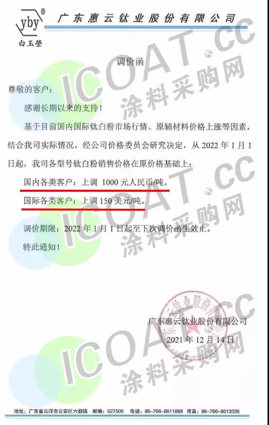惠云钛业:从2022年1月1日起,各型号钛白粉销售价格在原价格基础上: