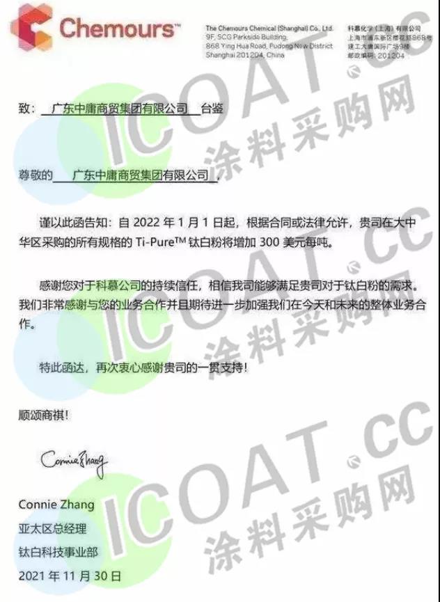 科慕(Chemours)钛白粉:2022年1月1日起,在大中华区采购的所有规格的Ti-PureM钛白粉的价格将上调300美元/吨(约合人民币1915元/吨)。