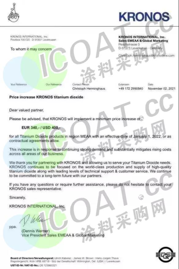 康诺斯(KRONOS):2022年2月1日起上调中东、非洲及亚洲(MEAA)地区所有型号钛白粉的售价340欧元/吨或400美元/吨(约2200-2600元/吨区间)。