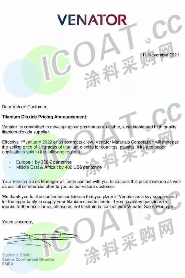 泛能拓(Venator):2022年1月1日起,将提高在下列地区销售的涂料、塑料、油墨和纸张应用的所有等级二氧化钛的售价: