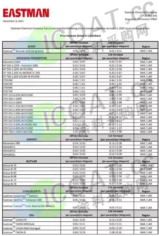 伊士曼(Eastman):2022年1月1日起上调二甲苯、新戊二醇(NPG)等72种重要化工产品的售价,除北美地区外大部分上涨0.15-1.5美元/千克(约1000-10000元/吨),其中个别产品如氯化聚烯烃(CPO)系列上涨最高达5.38美元/千克(约34236元/吨)。