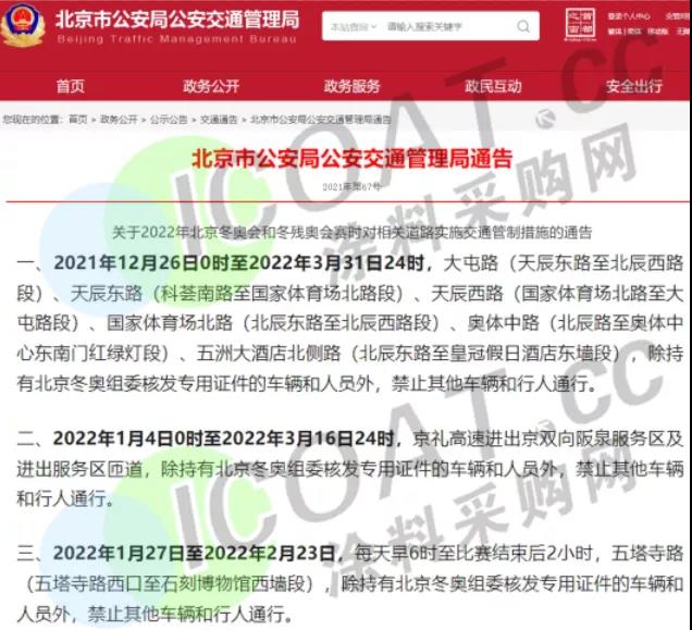 而在此前,北京市公安局公安交通管理局在其官方网站发布《关于2022年北京冬奥会和冬残奥会赛时对相关道路实施交通管制措施的通告》称,决定于12月26日0时至2022年3月31日24时,对部分路段采取分时、分段采取交通管制措施,共计96天。