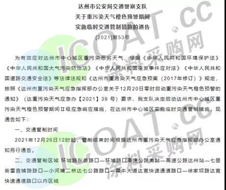 达州:2021年12月26日12时起,在达州市中心城区实施临时交通管制措施。