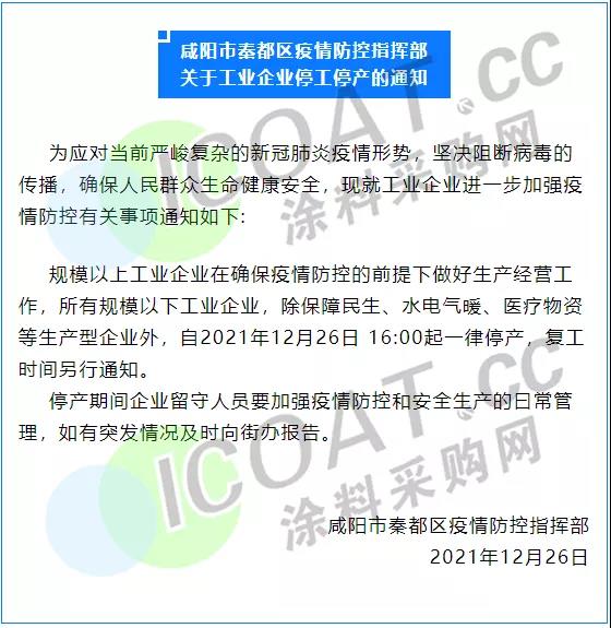 陕西咸阳秦都区:所有规模以下工业企业,除保障民生、水电气暖、医疗物资等生产型企业外,自2021年12月26日 16:00起一律停产,复工时间另行通知。辖区所有房屋建筑和市政基础设施工程(除地铁施工外)从2021年12月26日16: 00起全部停工。