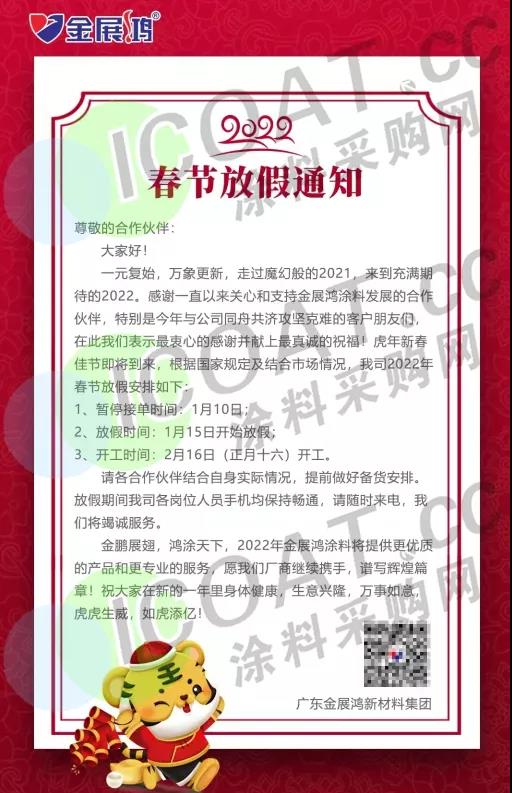 广东金展鸿新材料集团:1月10日暂停接单,1月15日开始放假,2月16日(正月十六)开工。