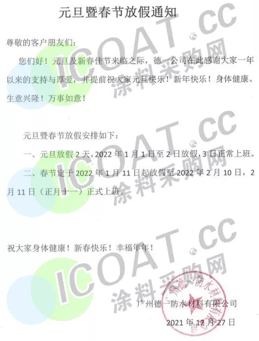 广州德一防水材料有限公司:春节定于2022年1月11日放假至2022年2月10日,2月11日(正月十一)正式上班。