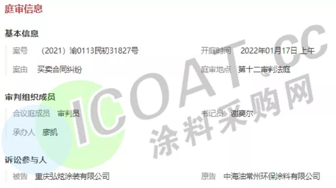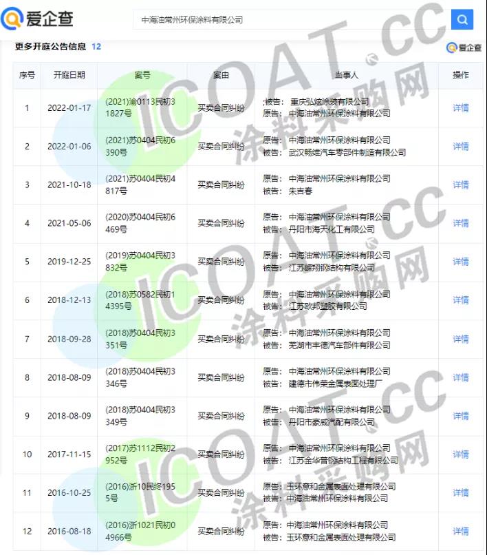涂料采购网查询得知,中海油常州环保涂料有限公司近期官司频频,共计12起开庭公告,横跨2016年至2022年6年光景,案由均为“买卖合同纠纷”,仅2022年就有2次开庭公告,被告分别为武汉畅维汽车零部件制造有限公司和重庆弘炫涂装有限公司。