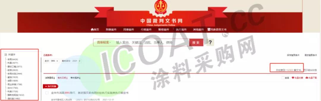 涉及官司诉讼的超过16000篇文书,排名靠前的诉讼关键字为合同(6426篇)、利息(3577片)、建设工程(2973篇),区域覆盖了北京、天津、河北、陕西、辽宁、江苏、山东、陕西等30余个省市地区,涉及到一审、二审等多种不同的情况,据涂料采购网不完全统计,近1000家涂料企业以原告/被告等身份被卷入官司诉讼。