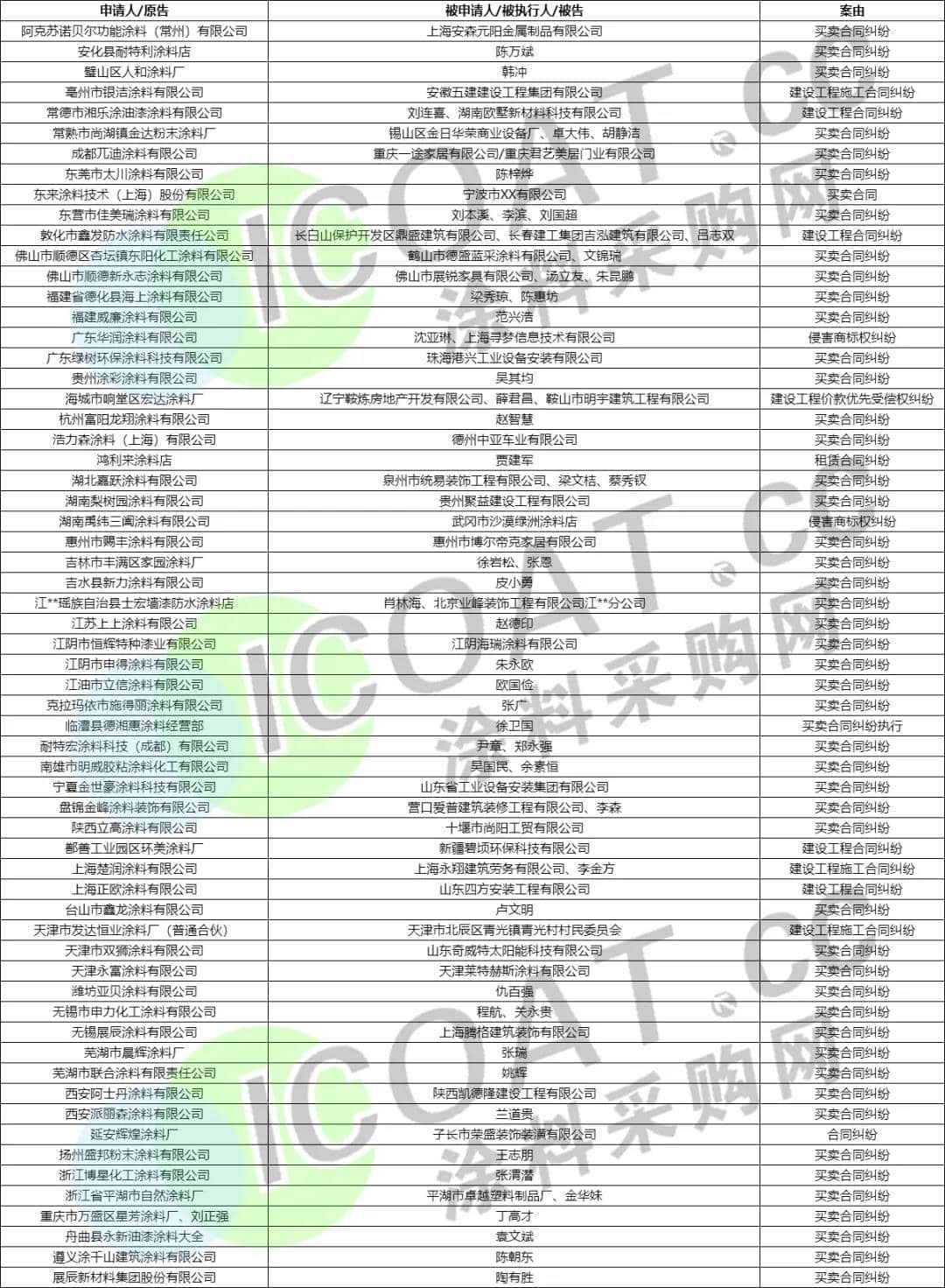 涂料采购网查阅了部分涂料企业作为原告/执行人的官司诉讼发现,这其中不乏东来涂料技术(上海)股份有限公司、浩力森涂料(上海)有限公司、阿克苏诺贝尔功能涂料(常州)有限公司、广东华润涂料有限公司、展辰新材料集团股份有限公司等多家知名企业,涉及到的案由多为买卖合同纠纷、建设工程施工合同纠纷、建设工程价款优先受偿权纠纷、合同纠纷等类型,涂料企业提出的诉求包括要求被执行人/被告支付工人工资、返工工资、检验费、案件受理费、材料费、申请保全费,或结欠货款、违约金等。