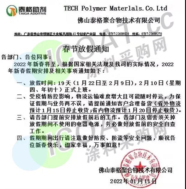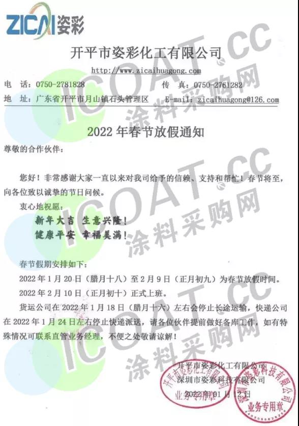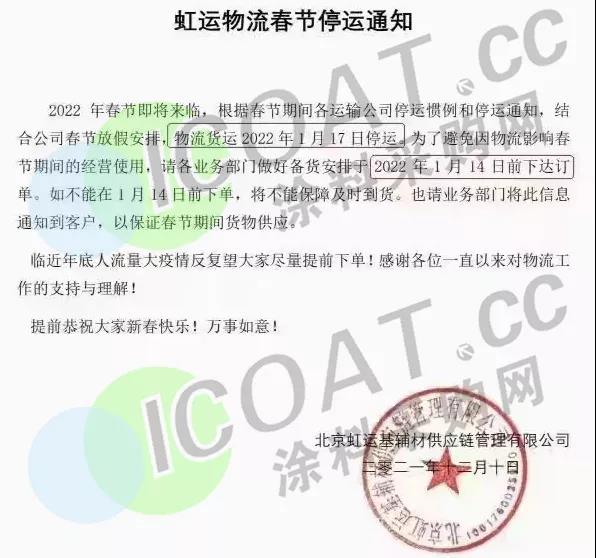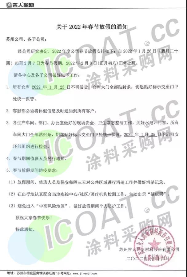 眼看离春节还有十几天的光景,部分涂料、化工企业已经开始放假,物流运输也几近暂停,忙碌了一年的化工人也基本结束了工作,或是准备过年。涂料采购网在这里提醒大家,外出和返乡时要做好个人防护,严格限制前往中、高风险地区及所在县(市、区、旗),非必要不前往中、高风险地区所在地市的其他县(市、区、旗),无论身处何地,注意安全防护,平平安安度过春节。