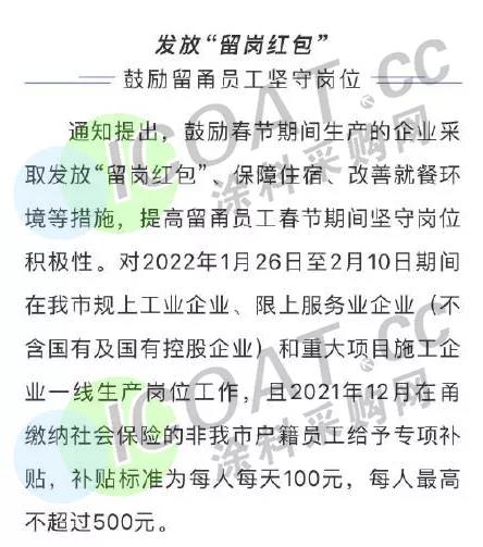 浙江宁波:每人每天100元,每人最高不超过500元对2022年1月26日至2月10日期间在规上工业企业、限上服务业企业(不含国有及国有控股企业)和重大项目施工企业一线生产岗位工作,且2021年12月在甬缴纳社会保险的非我市户籍员工给予专项补贴,补贴标准为每人每天100元,每人最高不超过500元。