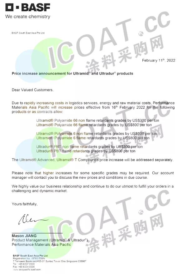 关于其他系列的高温尼龙价格的上涨将单独发布。