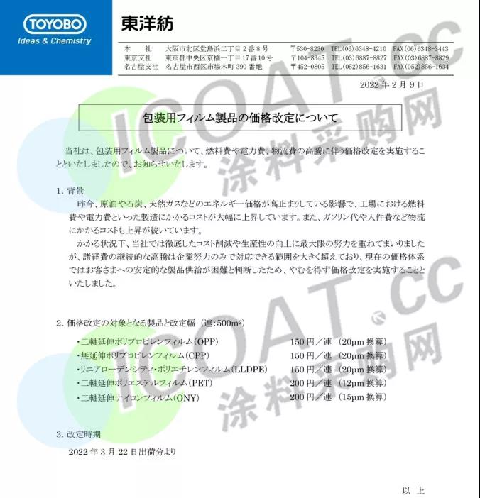 从3月1日发货起,将所有工业薄膜产品的价格上调10%。