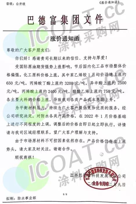 防水各类产品价格在2022年1月价格基础上进行不同程度的上调,调整后的价格自即日起立即执行。