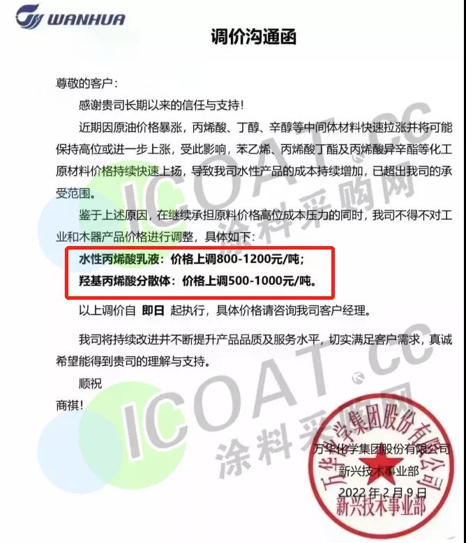 水性丙烯酸乳液:价格上调800-1200元/吨;羟基丙烯酸分散体:价格上调500-1000元/吨。以上调价自即日起执行。