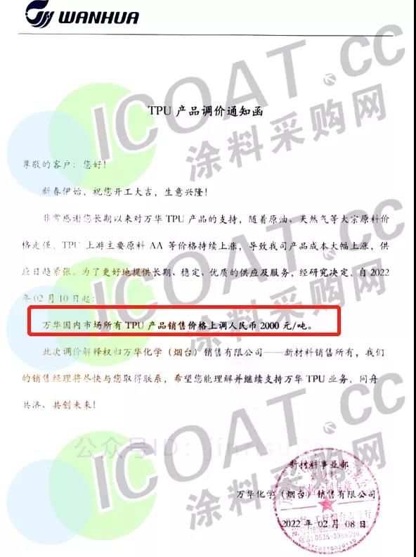 从2月10日起,提高万华国内市场所有TPU售价2000元/吨。