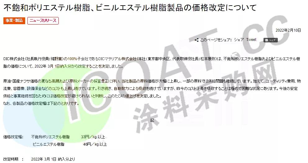 自3月1日起,提高不饱和聚酯聚酯树脂和乙烯基酯树脂等产品的价格,最高上涨40日元/kg,约人民币2192元/吨。