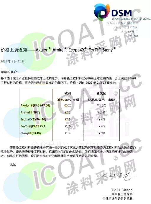 帝斯曼工程材料:自2月15日起,全球范围内提升以下工程材料的售价,最高上涨4500元/吨。