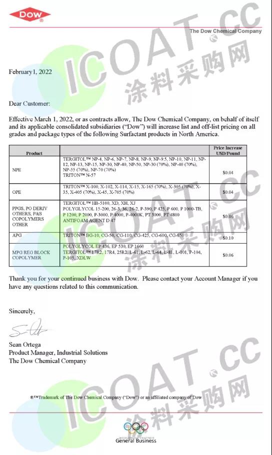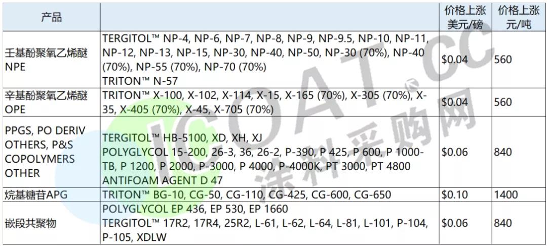 陶氏:2021年3月1日起,提高在北美所有表面活性剂产品的价格。最高上涨0.1美元/磅,约人民币1400元/吨。