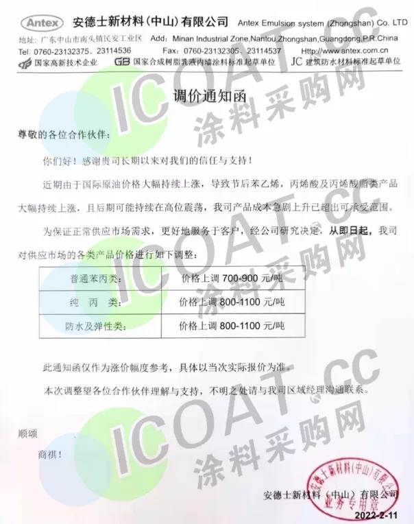 安德士新材料(中山)有限公司:对供应市场的各类产品价格进行如下调整:普通苯丙类:价格上调700-900元/吨;纯丙类:价格上调800-1100元/吨;防水及弹性类:价格上调 800-1100元/吨;此通知函仅作为涨价幅度参考,具体以当次实际报价为准。