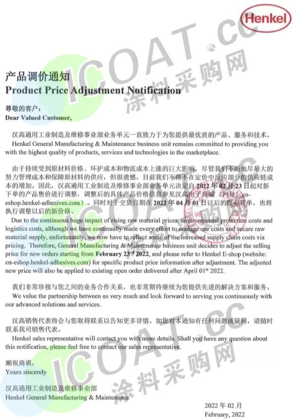 2月1日或之后提高北美所有聚氨酯系统产品的价格。
