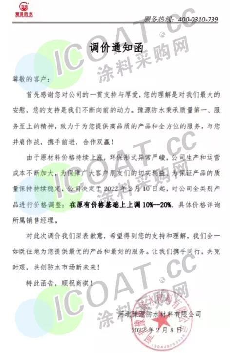 河北豫源防水材料:2月10日起,对全类别产品进行价格调整:在原有价格基础上上调10%-20%,具体价格详询所属销售经理。